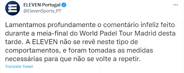 در پیام این شبکه تلویزیونی آمده است: «ما عمیقاً از اظهار نظر تاسف بار در نیمه نهایی تور جهانی پادل مادرید بعدازظهر ابراز پشیمانی و تاسف میکنیم. ELEVEN خود را در این نوع رفتار نمی بیند و اقدامات لازم برای عدم تکرار آن انجام شده است.»
