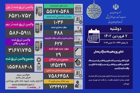 به گزارش گروه اجتماعی یکتا، به نقل از وبدا، از دیروز تا امروز ۷ فروردین ماه ۱۴۰۲ و بر اساس معیارهای قطعی تشخیصی، ۱۰۳۶ بیمار جدید مبتلا به کووید۱۹ در کشور شناسایی و ۴۸۸ نفر از آنها بستری شدند. مجموع بیماران کووید۱۹ در کشور به ۷ میلیون و ۵۸۶ هزار و ۴۵۸ نفر رسید.